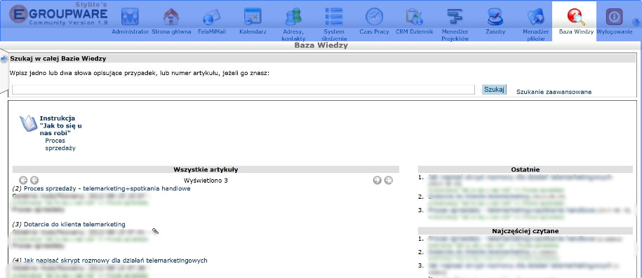 Moduł Bazy wiedzy to zbiór treści, która jest gromadzona w sposób sformalizowany – w postaci artykułów. Każdy artykuł: ma temat, jest przypisany do grupy tematycznej i jest opisywany słowami kluczowymi aby łatwiej można go było odnaleźć. Artykuły można grupować przyporządkowując je do kategorii (np. instrukcje, raporty itp.) Moduł Bazy Wiedzy jest miejscem merytorycznej komunikacji wewnątrz firmowej, z zapisem tej komunikacji - po to by:
